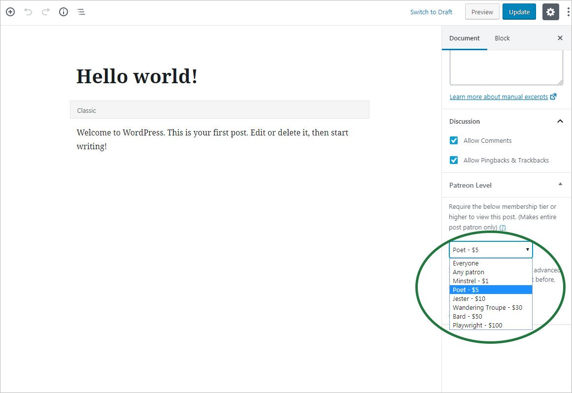 시작하려면 후원자 로 지정하려는 게시물을 편집 하고 아래로 스크롤하여 "후원자 레벨" 드롭다운 메뉴를 엽니다 .액세스 권한을 부여할 계층 레벨을 선택한 후 업데이트 버튼을 클릭하고 게시물을 저장합니다.