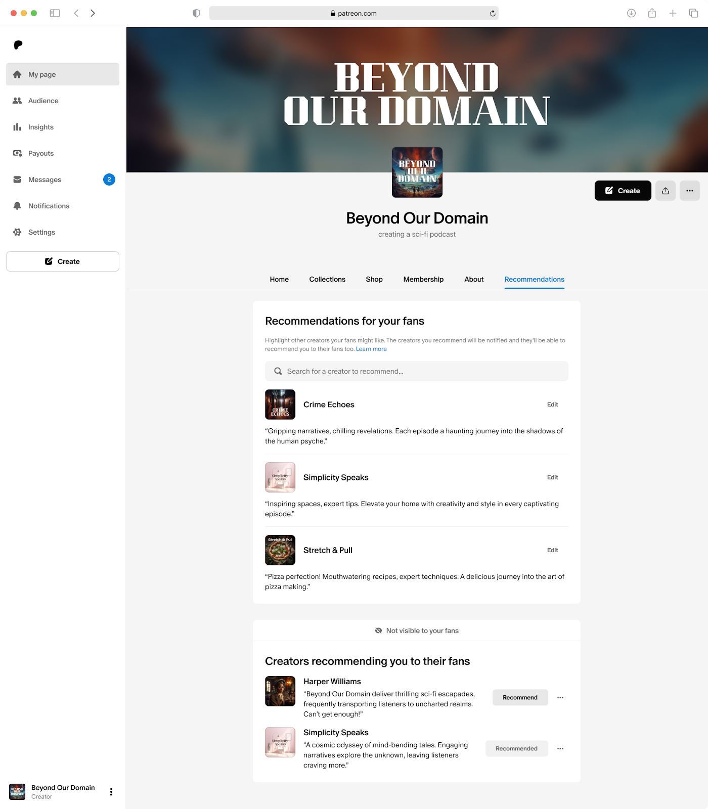 - 팬에게 추천한 크리에이터 섹션을 찾으세요 . 여기에서 팬에게 추천한 모든 크리에이터를 찾을 수 있습니다.