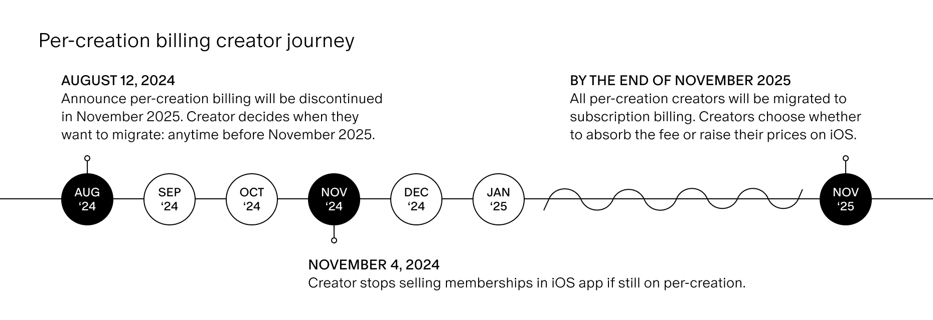 2024년 11월부터 Apple은 Patreon 앱을 Apple App Store에서 계속 사용할 수 있도록 디지털 상품과 새로운 멤버십에 대해 iOS 인앱 구매를 사용하도록 Patreon에 요구할 예정입니다. iOS 인앱 구매 시스템은 구독 청구 모델만 지원하므로 다른 청구 모델을 사용하는 크리에이터 는 인앱 구매가 출시되면 iOS 앱에서 새로운 멤버십을 판매할 수 없습니다. Apple은 Patreon의 크리에이터가 지원되지 않는 청구 모델을 계속 사용하거나 iOS 앱에서 거래를 비활성화하는 경우 전체 앱이 App Store에서 제거될 위험이 있음을 분명히 했기 때문에 2025년 11월까지 모든 크리에이터를 구독 청구로 전환하기 위한 16개월 간의 마이그레이션 여정을 시작했습니다. 크리에이터는 더 이상 선불 청구를 활성화할 수 없으며, 2024년 11월 1일까지 설정
