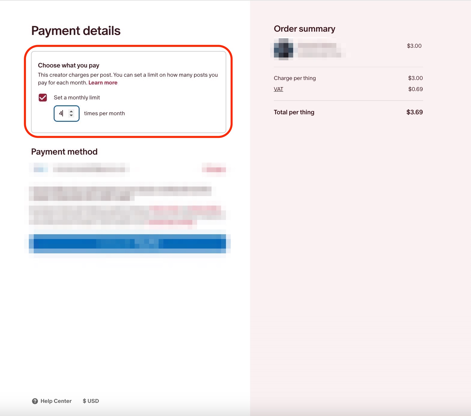 월간 최대치 라고도 불리는 , 멤버의 월간 한도는 주어진 달에 유료 게시물에 대해 청구되는 최대 금액입니다. 월간 한도는 멤버가 Patreon에 가입할 때 동의한 금액보다 더 많은 금액을 청구받지 않도록 보장합니다.이 한도는 멤버십 확인 중에 설정되며 한 달 내내 편집할 수 있습니다. 걱정하지 마세요. 월 한도를 낮추어도 보류 중인 청구서는 제거되지 않습니다. 월 한도가 활성화되지 않은 경우 멤버는 귀하가 만든 모든 유료 게시물에 대해 청구될 수 있습니다.