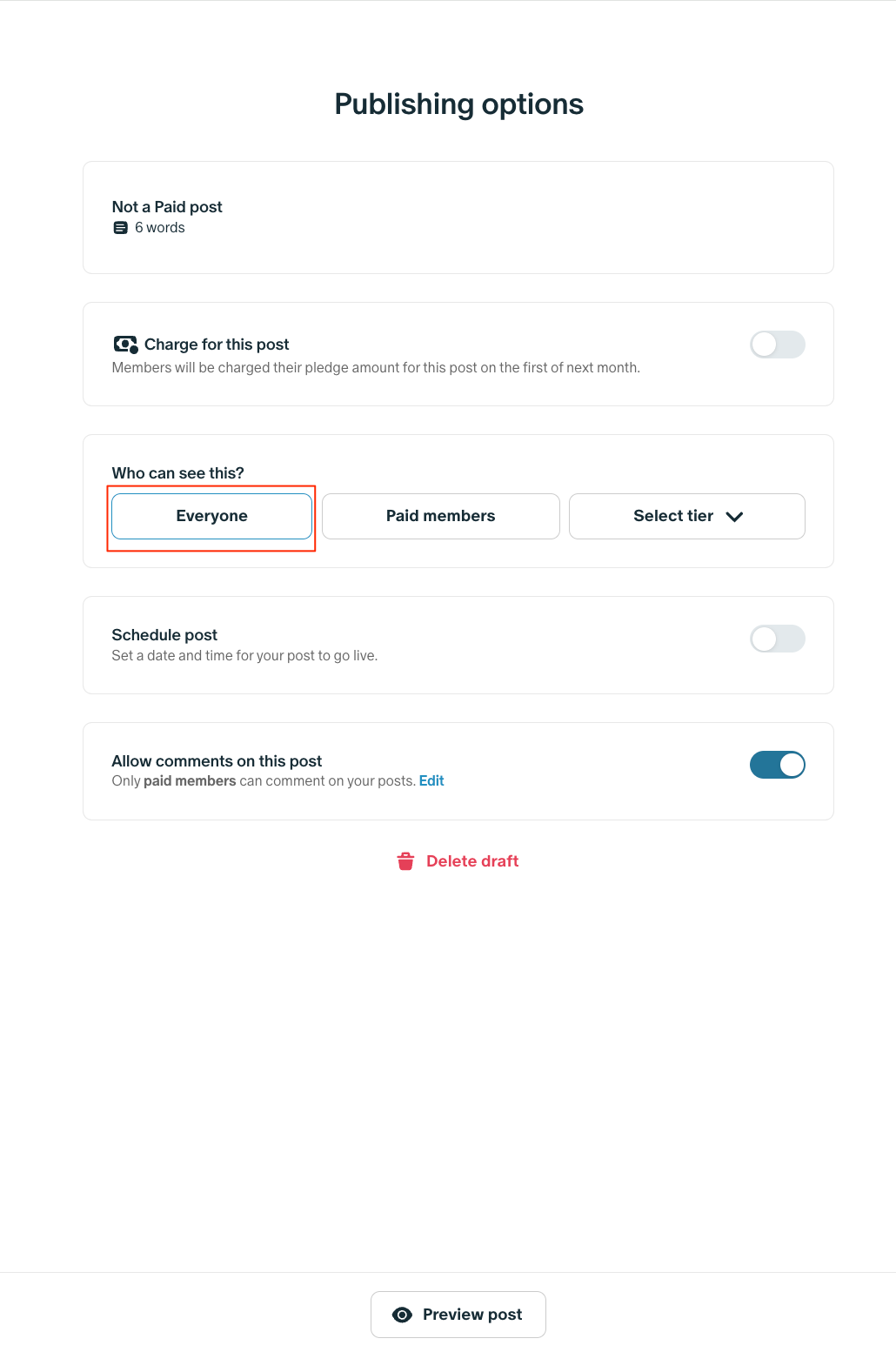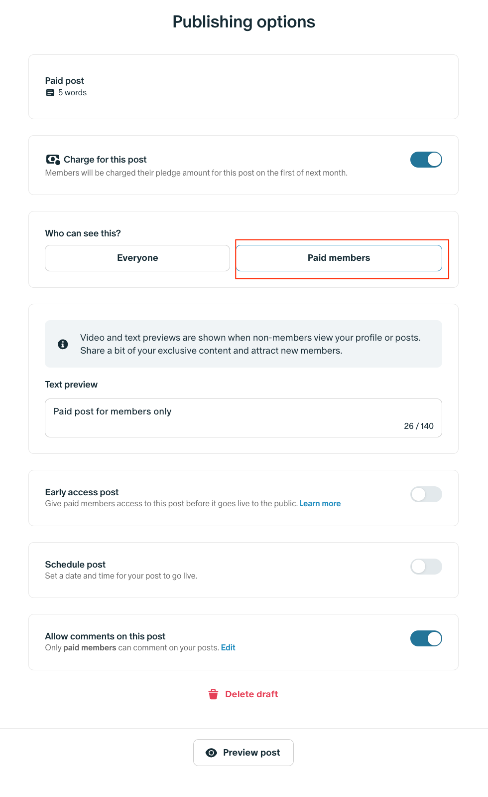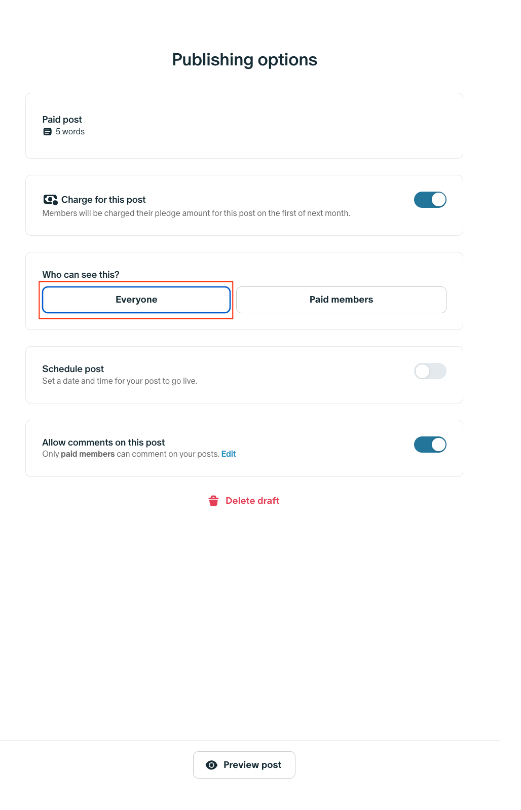 유료 회원은 보류 중인 청구서로 청구되고 게시물은 공개적으로 표시됩니다. 따라서 모든 유료 회원, 무료 회원 및 팬이 이 게시물을 볼 수 있습니다. 보류 중인 청구서는 다음 달 1일에 처리하거나 회원이 귀하에게 멤버십을 취소하면 즉시 처리합니다.