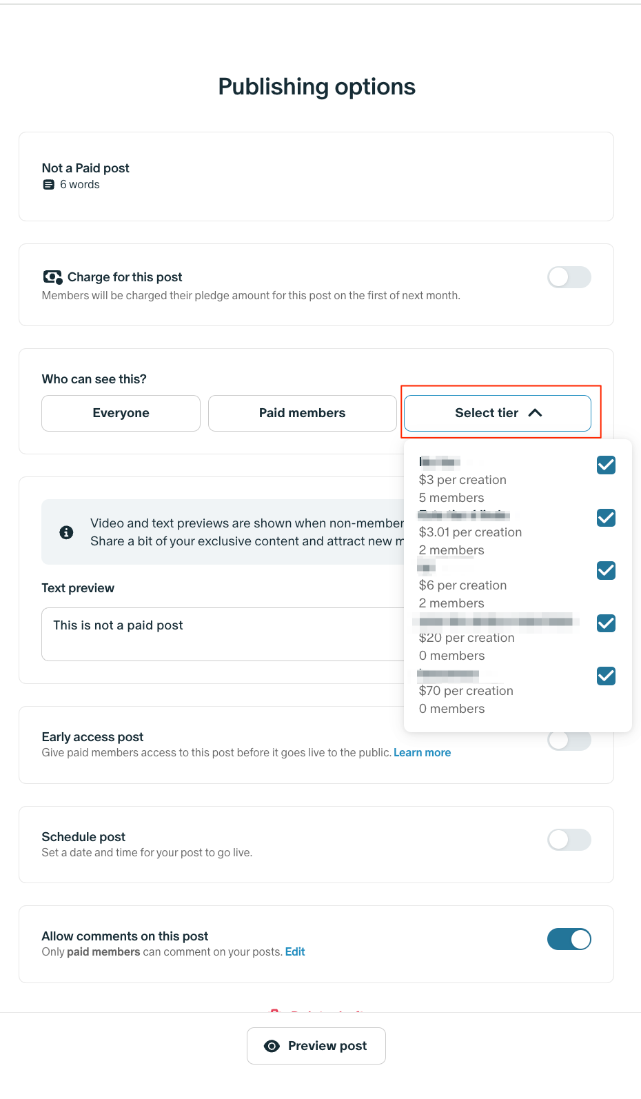 게시물에 대해 멤버에게 요금을 청구하려면 게시할 때 이 게시물에 대한 요금 청구 상자를 클릭해야 합니다.