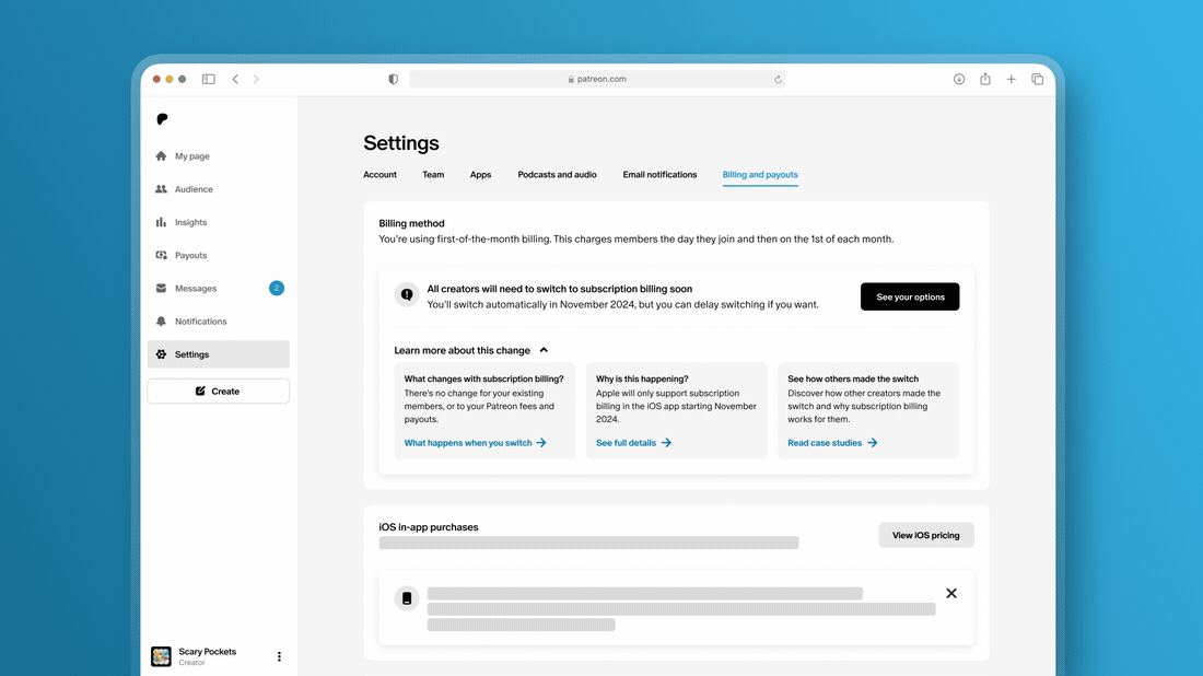 2024년 11월부터 Apple은 Patreon 앱을 Apple App Store에서 계속 사용할 수 있도록 디지털 상품과 새로운 멤버십에 대해 iOS 앱 내 구매를 사용하도록 요구할 예정입니다. Apple의 앱 내 구매 시스템은 Patreon의 구독 청구 모델만 지원합니다. iOS 앱에서 크리에이터의 작업을 유지하려면 Apple의 앱 내 구매 시스템을 통해 판매해야 하며, 즉 모든 크리에이터가 iOS 앱에서 구독 청구를 사용해야 합니다. 즉, 창작물당과 같은 다른 청구 모델을 사용하는 크리에이터는 앱 내 구매가 출시되면 더 이상 iOS 앱에서 멤버십을 판매할 수 없습니다. 또한 Apple의 명령에 따라 2025년 11월까지 모든 크리에이터를 구독 청구로 전환하기 위한 마이그레이션 프로세스를 시작합니다. 창작물당 청구를 사용하는 크리에이터는 2025년 11월까지 이 모델을 유지할 수 있지만, 준비가 되면 구독 청구로 마이그레이션하여 iOS 앱에서 Patreon을 계속 성장시키는 것이 좋습니다 . 창작물당 청구에서 구독 청구로 전환하는 방법